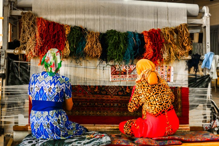 2 Frauen beim Knüpfen eines Wollteppichs