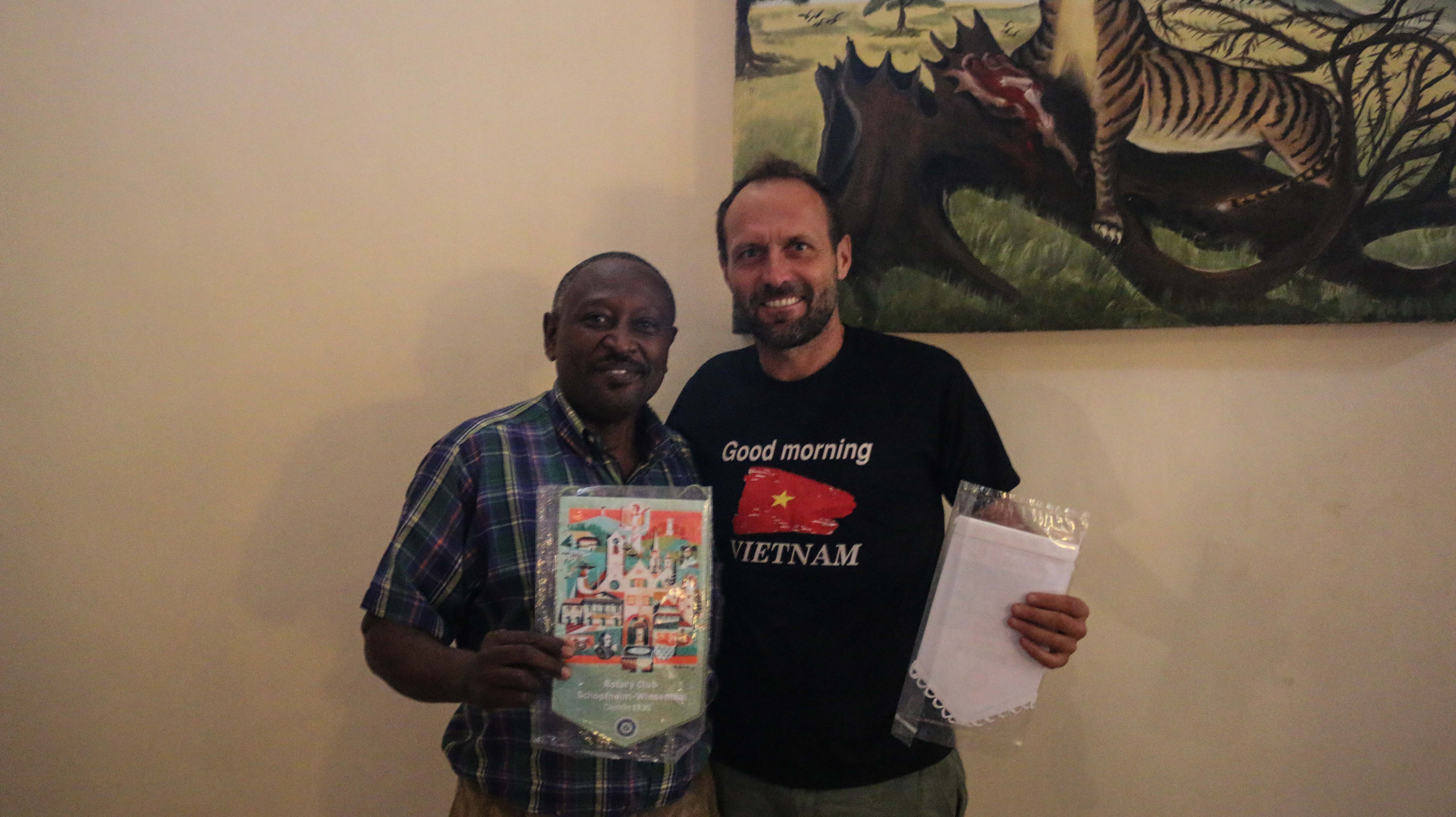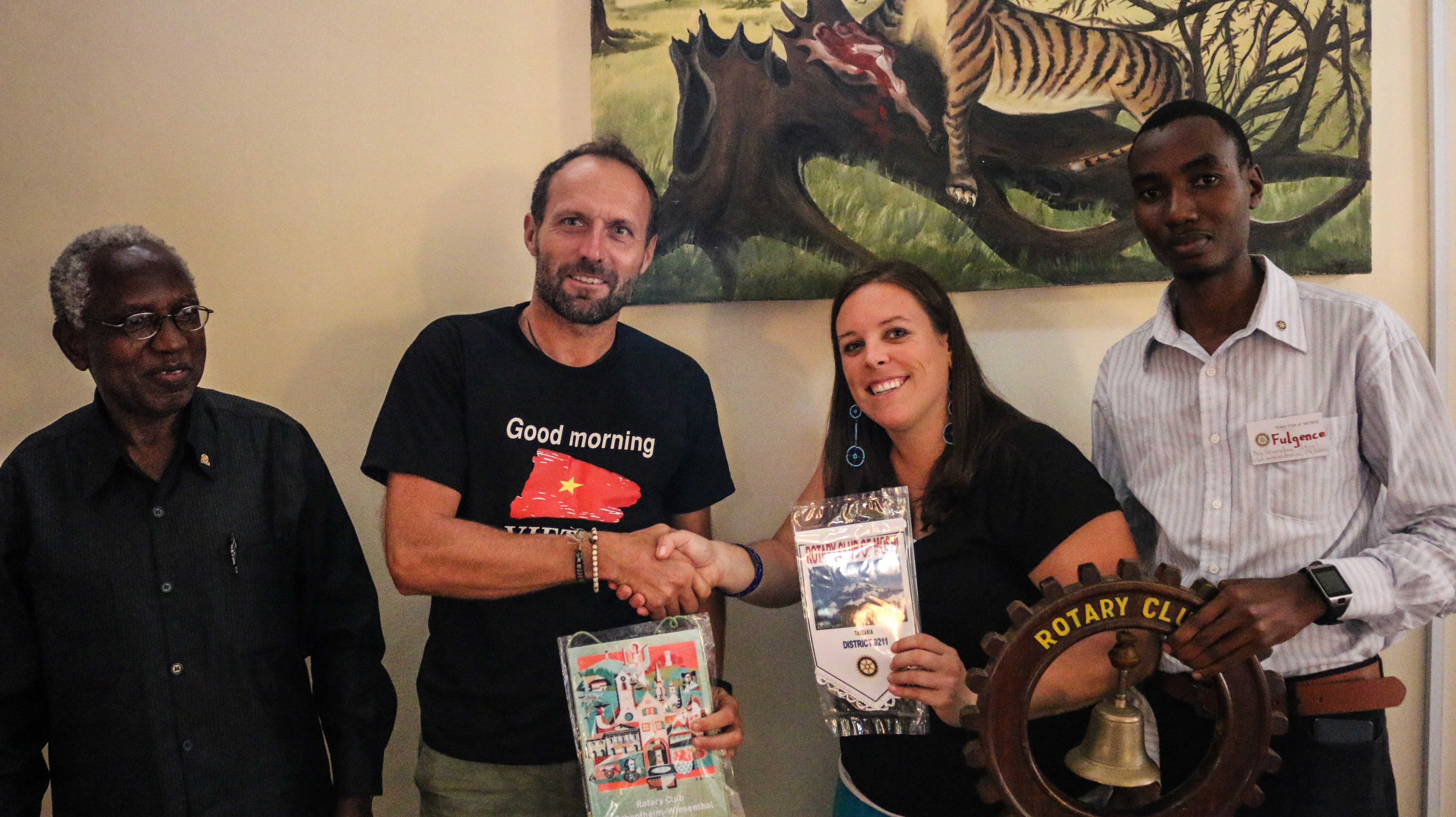 Am Hotel Kilimanjaro Crane hängt ein Schild des Clubs mit den Daten zum Meeting. Zuerst treffe ich Fulgence, am Hemdkragen trägt er das Rotaryemblem. Er ist erst 24 Jahre alt und schon im Vorstand tätig. Der Präsident ist zur Zeit für längere Zeit in Südafrika und daher führt, die aus Chicago stammende Amerikanerin Kerry durch das Programm.